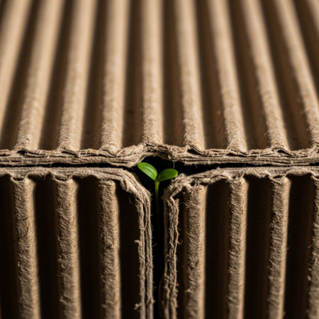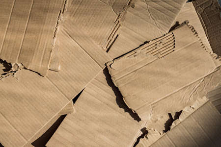 Overhead view of a dense pile of flattened, recycled cardboard boxes and loose cardboard pieces. Discarded paper and plastic remnants intermix within the heap, showing signs of waste management.