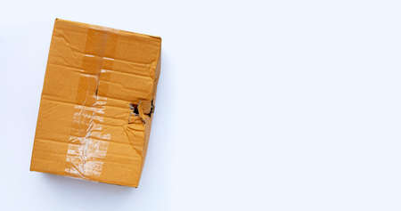 Brown cardboard box with a brown ribbon on a white background. Horizontal