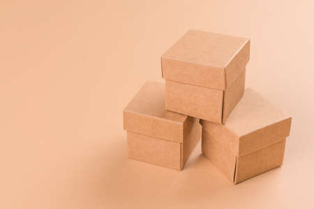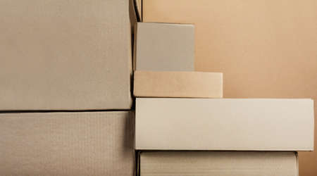 Paper boxes for storaging or transportation over light brown background with copy space. Sustainable packaging concept. Parcel delivery and packing service
