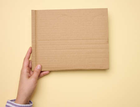 Female hands with empty open cardboard boxes on yellow background. Top view