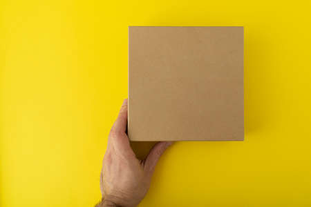 Square cardboard box in hand on yellow background. Copy space. Mock up