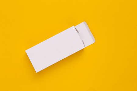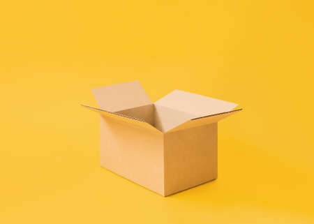 box. Design template with copy space. Opened cardboard box on bright yellow background