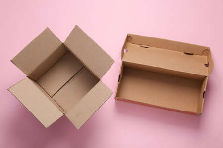 Cardboard boxes placed on a beige background. View from directly above. Shipping concept