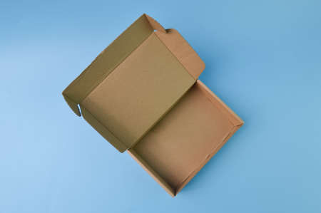 Top overhead above closeup view photo of unpacked empty box on blue background with blank copy space
