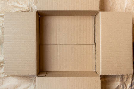 Open brown box with space on blurred background, empty paper box, simple packaging design