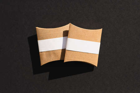 top view flat lay recyclable types of paper packaging on a blue background, paper bag, disposable glass, cardboard box