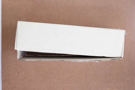 Close up image of brown paper box with white ground.