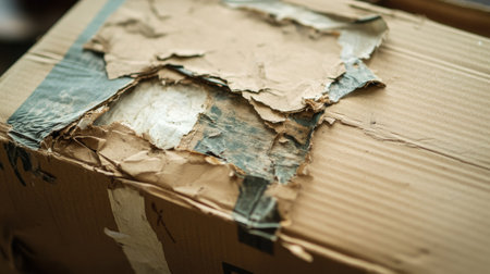 A close-up view of a damaged cardboard box showing torn edges and a peeling surface, highlighting the wear and tear that packages often endure during shipping.