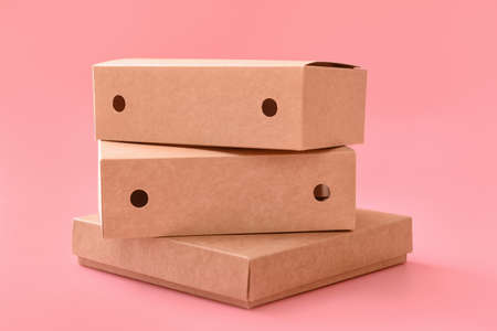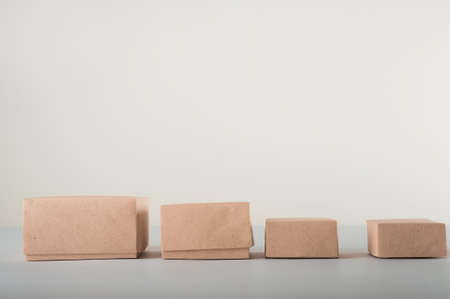 Cardboard boxes on a white background. Ecological packaging of paper products close-up and copy space. Craft containers, packaging, boxes, packages.