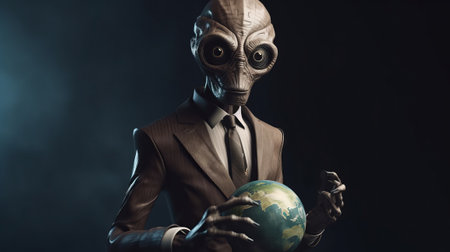 Alien dressed as a banker holding an earth planet. Created with Generative AI technology