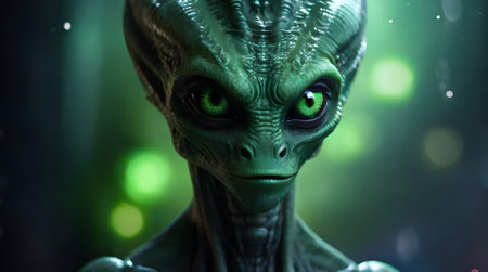 Close-Up of an Alien with Large Eyes in a Mysterious Sci-Fi Setting. High quality photo