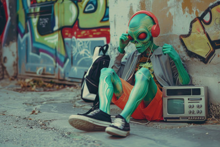A relaxed alien with stylish headphones and backpack sits by a graffiti wall, listening to a vintage radio.