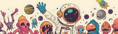 This vibrant and whimsical depicts an astronaut making new friends with a diverse group of colorful quirky alien creatures in an imaginative otherworldly setting The astronaut appears open and