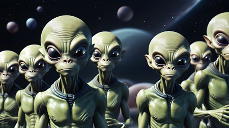 Three extraterrestrial beings with large, expressive eyes and smooth green skin, depicted in a futuristic cosmic environment with a glowing blue background.