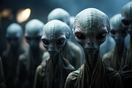 Extraterrestrial beings with large, reflective eyes and wrinkled skin observing something, while two similar figures stand blurred in the background, enhancing the mystery of the encounter