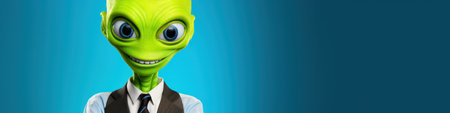 A fictional green alien in an electric blue jacket and big sunglasses web banner with copy space. High quality photo