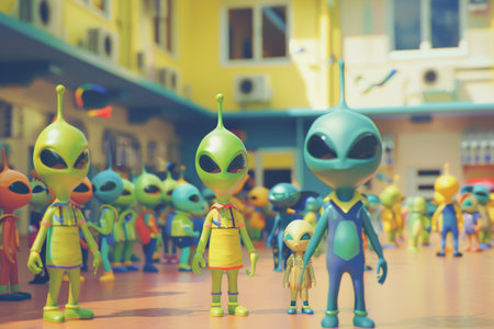 Fashion trends, with aliens wearing vibrant and bizarre outfits. Generative AI