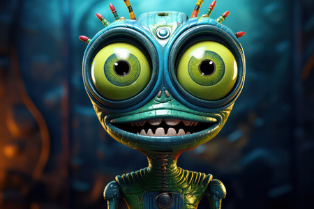 3D rendering of a cute cartoon alien with green eyes and teeth.
