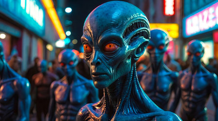 Futuristic aliens with glowing blue eyes in a neon-lit cityscape. Extraterrestrial beings in a vibrant urban setting. Concept of sci-fi, futuristic, extraterrestrial, and neon lights.