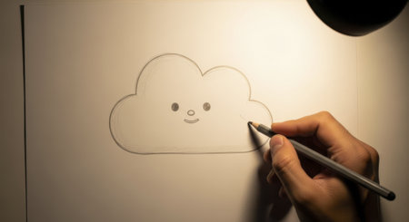 Hand drawing a minimalist cartoon cloud with a friendly face on white paper using a pencil, illuminated by a light source.