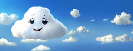 A fluffy, white cloud with a happy expression floats against a bright blue sky. The cloud is depicted with soft textures, and the lighting suggests a daytime setting. This image is suitable for a variety of commercial and editorial uses related to weather, cartoon characters, or inspirational themes.