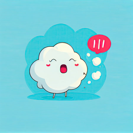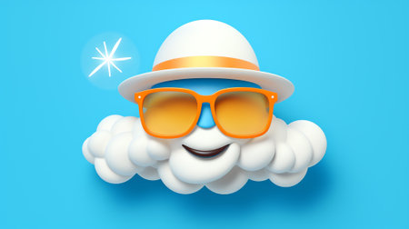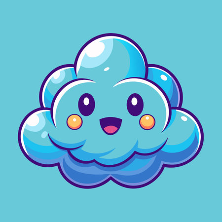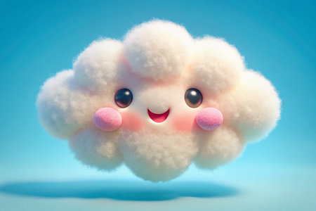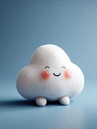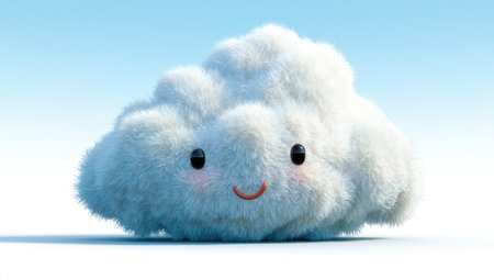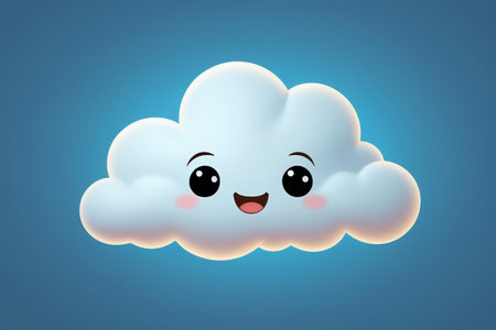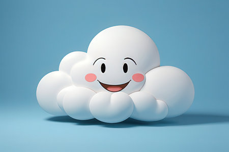 A cheerful, cartoon-style cloud floats against a pale blue background. Its soft, white form has simple features like eyes and a smile, giving it a friendly expression. The lighting is even and bright, creating a clean and airy aesthetic. The image could be used in a variety of commercial or editorial contexts, from children's products to weather-related imagery.