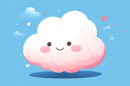 Cartoon illustration of a cute pink cloud smiling and floating in a blue sky, surrounded by little white clouds and hearts