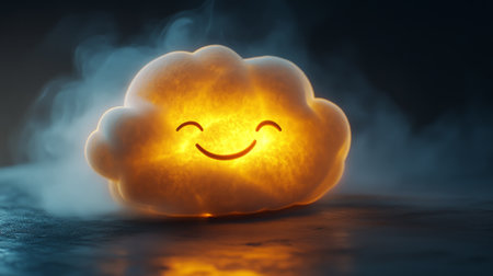 Glowing happy cloud smiling in a dark foggy environment