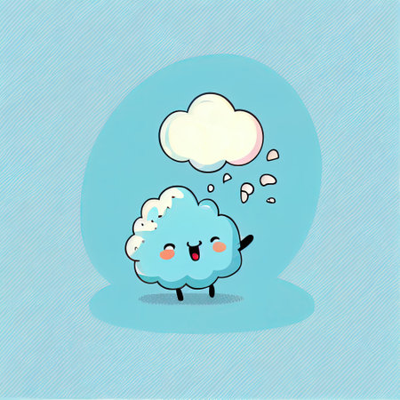 A fluffy, cartoonish cloud with a happy expression. The cloud is light-blueish white and appears soft, fluffy, and stylized. A soft, bright light is casting gentle shadows, creating a lighthearted and peaceful atmosphere. This illustration is well-suited for children's books, greeting cards, or other commercial or editorial projects.