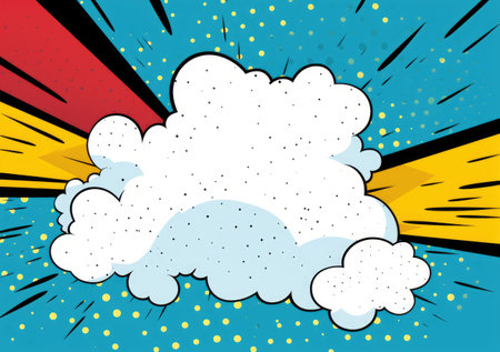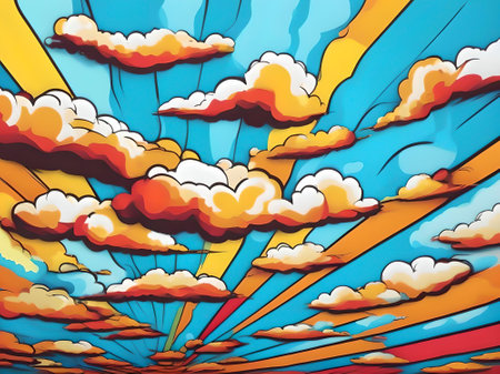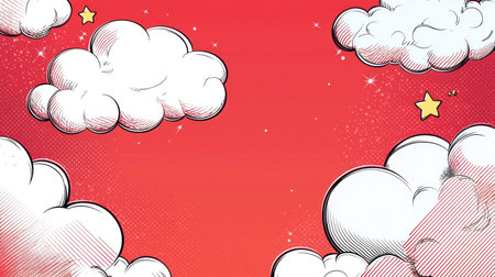 Colorful comic-style clouds on a vibrant red background with stars, creating a whimsical and playful atmosphere for creative projects.
