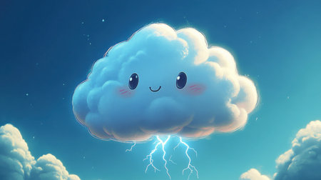 A whimsical cartoon cloud features a happy face and vibrant colors, surrounded by a blue sky. It embodies joy and playfulness with a lightning bolt, perfect for illustrative designs.