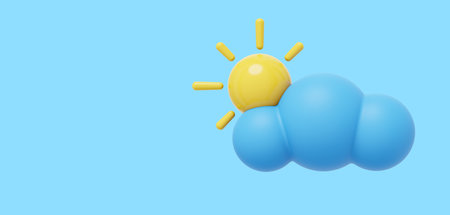 Blue cartoon cloud with sun. 3D rendering. Icon on blue background, space for text