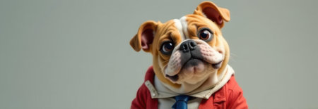 Studio portrait of an adorable bulldog puppy wearing a suit and tie, tilting its head with a curious expression, against a gray backdrop, providing ample space for text or design elements