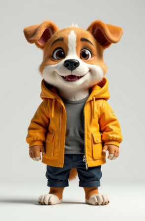 Full-length portrait of an adorable, smiling cartoon dog wearing a yellow raincoat, gray shirt, and blue pants, standing against a simple gray background