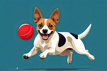 A cheerful dog leaps into the air, joyfully reaching for a bright red ball. The dog's expression radiates excitement as it plays against a vibrant blue backdrop, capturing a lively moment of fun.