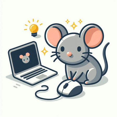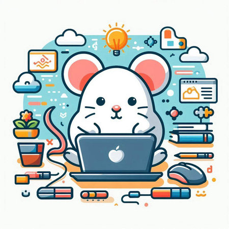 Mouse with laptop and light bulb on white background. Vector illustration.