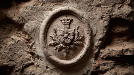 A close view of a stone relief with intricate floral design and crown set in an ancient structure, showcasing historical craftsmanship.