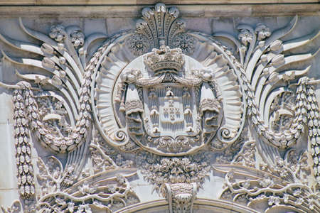 Stone bas-reliefs above the front door. Arms from different regions of Spain, in the Spanish village - Poble Espanyol