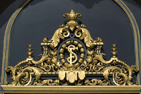 Details, and ornaments of wrought iron fence with gate.