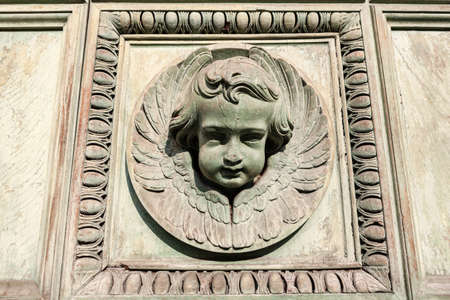 Face in wall plaque . Craft angel head on the church wall