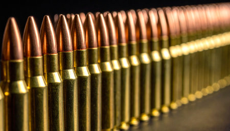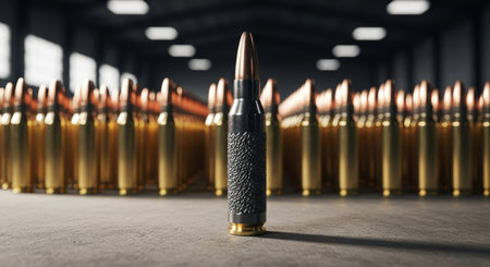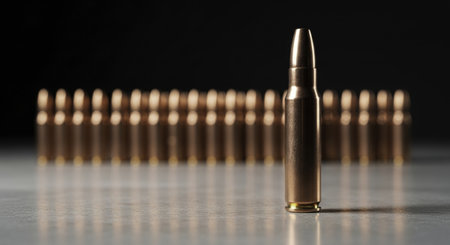 Bullets upright in a precise row on a dark glossy surface with clear reflections, evoking themes of ammunition, security, danger, conflict, and law enforcement readiness