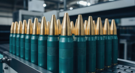 Dozens of newly manufactured artillery shells with gleaming brass tips and textured teal metal bodies neatly arranged on a conveyor belt in a modern weapons factory.