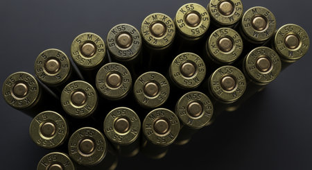Hands clad in gray gloves delicately handle rifle cartridges, meticulously arranging them among a spread of glaming 5.56mm bullets on a rustic black table.