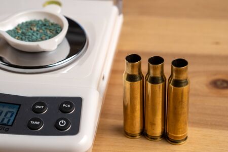 Production of cartridges for a rifle, reload. Empty shells and gunpowder scales