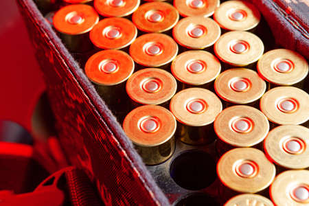 Shotgun cartridges in a cartridge bag in red light close up