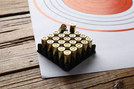 Shooting target and bullets on wooden table, closeup