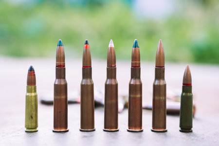 Close-up view of different ammunition rifle cartridges standing upright in a row. Various bullet types and calibers used in military and combat situations. Concept of war, army equipment and weapon supplies with shallow depth of field.