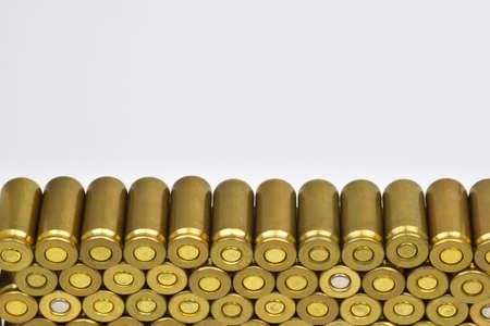 Rows of cartridge cases close-up. Above them there is space for an inscription or advertising on a white clipping background