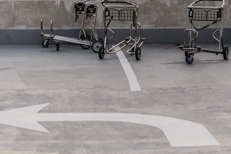 Yellow arrow symbol or sign on platform in the queue waiting for the skytrain. Sign for passenger train that is ridden primarily by commuters. Bangkok, Thailand.