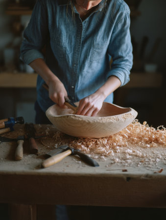 Woman in chambray shirt carves wooden bowl by hand in rustic workshop, showcasing craftsmanship and sustainable handmade design